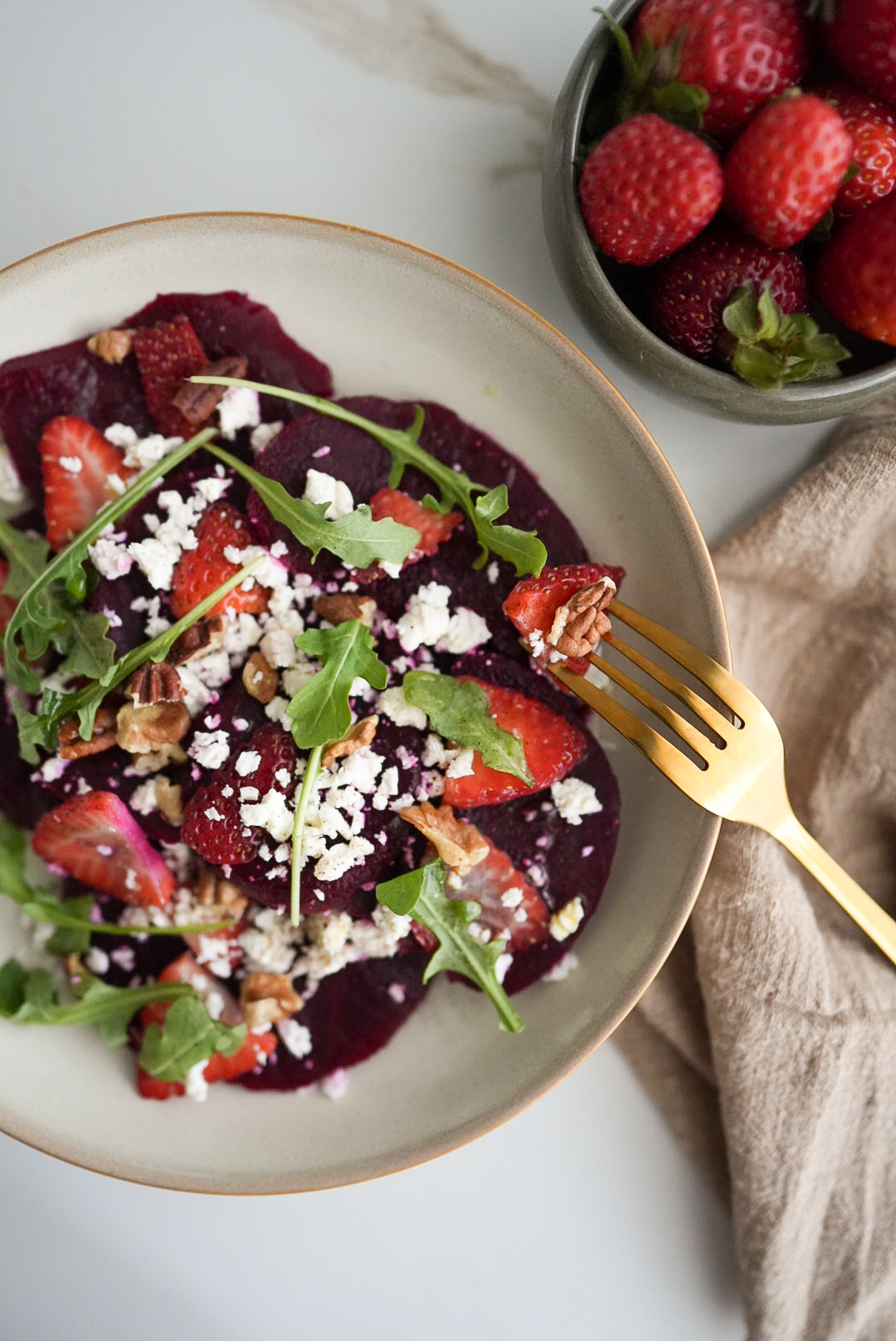 1. Couper les betteraves cuites en fines tranches et les disposer sur une grande assiette.