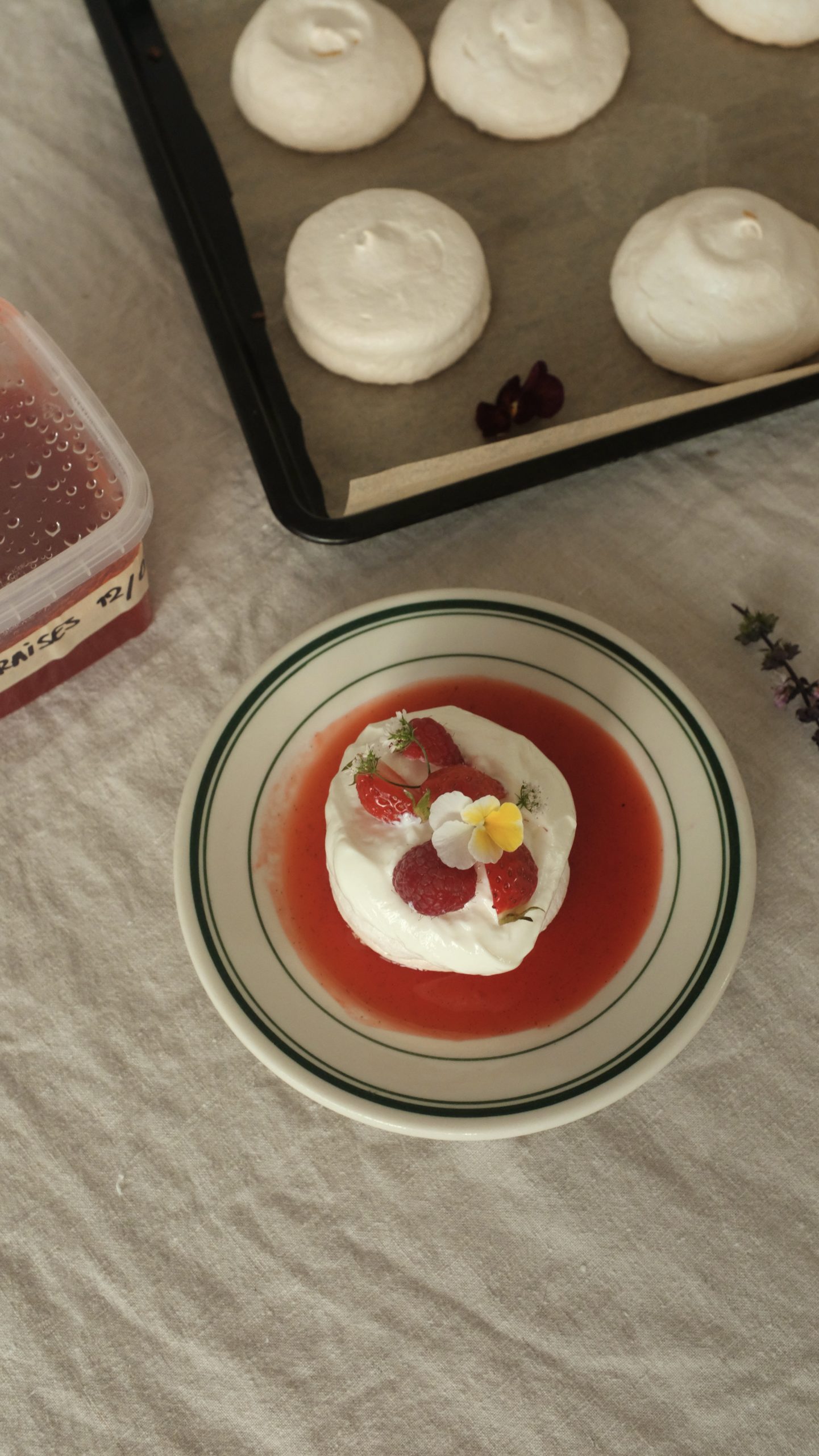 - Assembler : Sur chaque assiette, déposer une meringue. Ajouter la crème au labneh par-dessus, en formant un dôme. Garnir avec des fraises coupées, 1 ou 2 framboises, et quelques fleurs comestibles (pensées, fleurs de coriandre). Verser le coulis de fraises au fond de l’assiette. Servir immédiatement.